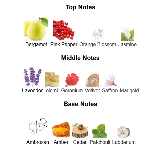 - Middle (Heart) Notes: Lavender, Geranium, Nutmeg