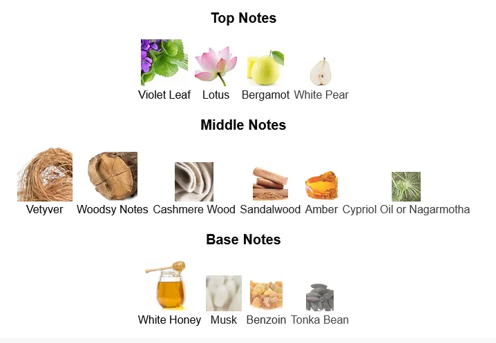 - Top Notes: Bergamot, Violet Leaf, Cardamom