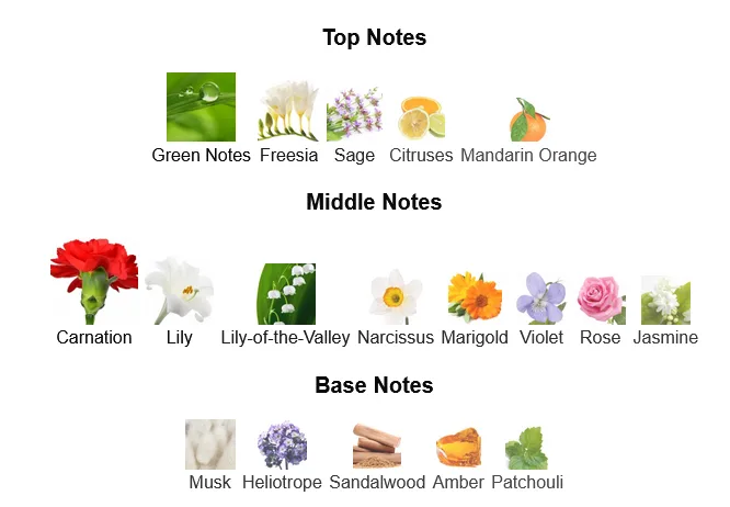 - Middle (Heart) Notes: Lily of the Valley, White Flowers, Jasmine