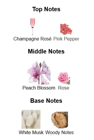 - Top Notes: Rosé Champagne, Black Currant, Peach