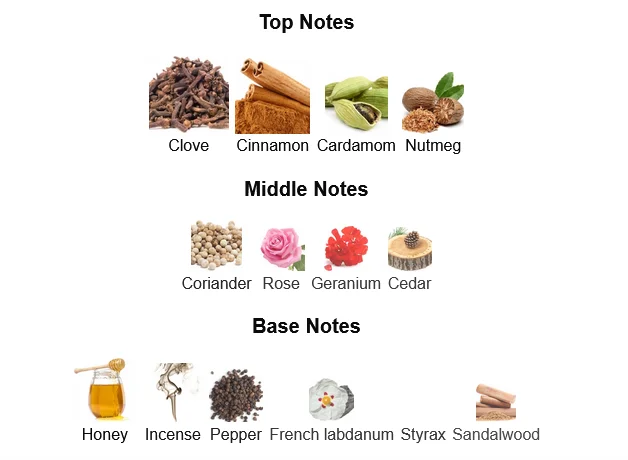 - Middle (Heart) Notes: Spices, earthy accords, resinous elements