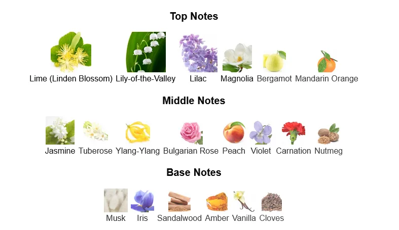 - Middle (Heart) Notes: Violet, Jasmine, Ylang-Ylang