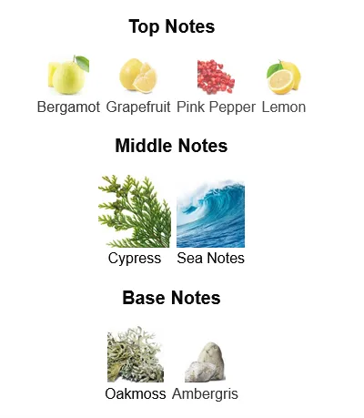 • Top Notes: Citrus notes (bergamot, lemon), Sea salt, Marine accord
