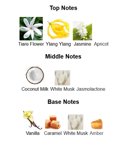 - Middle (Heart) Notes: White Flowers (Jasmine, Frangipani, Tuberose)