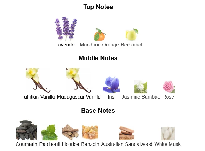 - Base Notes: Vanilla, Sandalwood, Tonka Bean
