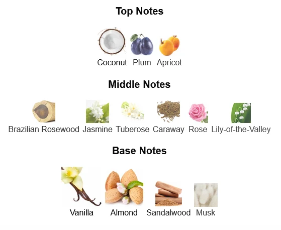 - Base Notes: Vanilla, Sandalwood, Musk, Tonka Bean
