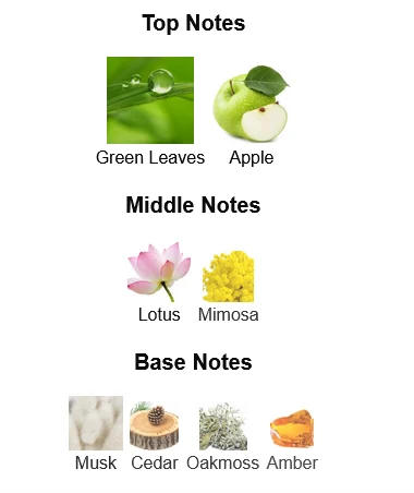 - Top Notes: Green Apple, Fresh Water Accord, Lemon